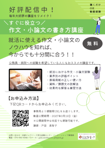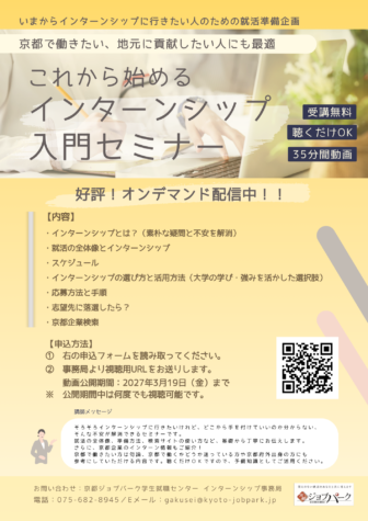Topicsトピックス 【終了いたしました】大好評!!「グループディスカッション完全攻略講座」オンデマンド配信 【終了いたしました】大好評!!「オンデマンドで学べる作文・小論文の書き方講座」配信 【終了いたしました】大好評!!「これから始めるインターンシップ入門セミナー」オンデマンド配信 【終了いたしました】大好評!!「生成AIと就職活動講座」オンデマンド配信 【終了いたしました】オンデマンド配信申し込み受付中!京都業界研究10選 【終了いたしました】インターンシップ・オープンカンパニーの受入れに積極的な京都の企業・福祉法人のオンライン企業説明会 お知らせ一覧