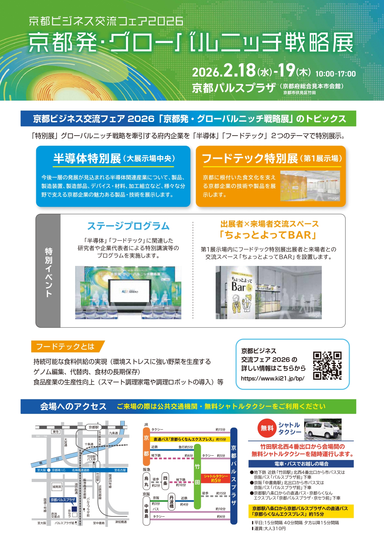 半導体とフードテック特別展開催! BtoBに特化した京都最大級の展示商談会をのぞいてみよう! 地下鉄竹田駅から無料のシャトルタクシーをご利用ください。