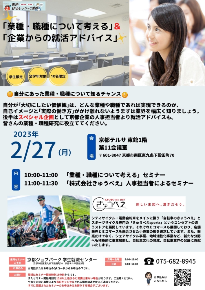 【終了しました】2/21(水)Z世代おいでやす!学生によるjob博 2024年1月22日 新着情報カテゴリートピックス/学生 学生の学生による学生のための就活イベント開催 令和6年2月21日水曜日 13時~16時(受付12時30分から) 京都産業会館ホール北室(京都経済センター2階) 地下鉄四条・阪急烏丸駅26番出口 徒歩5分 ここがポイント ... 詳しく見る