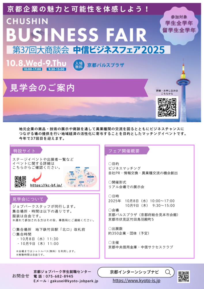 京都企業10選開催決定!対面(10/25・11/8・11/15)&WEB(10/27・11/10・11/17)受付開始! 2025年9月27日 新着情報カテゴリートピックス/学生/留学生 京都業界研究10選 開催決定! 1.2回生向け就活準備企画 2025 インターンシップは、まず京都 !!~体験先を近くで探そう~ 企業分析 京都業界研究10選セミナー&グループディスカッション。 お申込みはこちら ▼▼▼... 詳しく見る