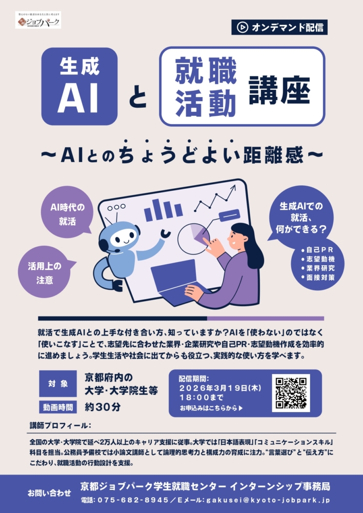 大好評!!「生成AIと就職活動講座2025」オンデマンド配信 2025年12月15日 新着情報カテゴリートピックス/学生/留学生 生成AIと就職活動講座をオンデマンド配信 学生の皆様の就職活動にお役立ていただける、生成AIと就職活動講座をオンデマンドで配信いたします。 就活で生成AIとの上手な付き合い方、知っていますか? AIを「使わない」のではな... 詳しく見る